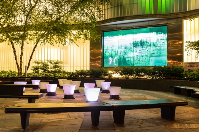 This plaza at the corner of Spring and Cameron Streets is part of the United Therapeutics (UT) downtown Silver Spring, Md. co-headquarters. If you have a chance to visit—and we recommend that you do—you will notice immediately that everything here is not typical of most public art installations. For example, the plaza features a 16 feet by 9 feet video display—The Biowall—which, year-round, runs a continuous loop of about 50 hours of soundless, original, non-commercial two-minute clips featuring life science, educational, and artistic videos created by artists, educators, scientists, and others from around the world. If you sit for a moment, you also will notice that the images seem in kinship with the music, which is itself is a collection of original compositions by musicians from around the world.