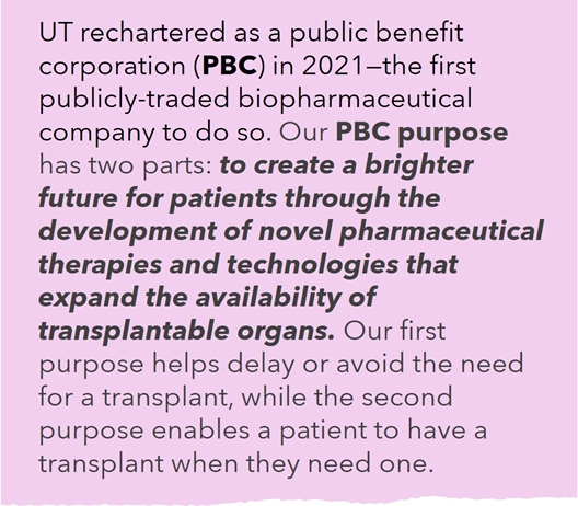 Our company was established by parents trying to save the life of their child who had been diagnosed with a rare and terminal disease called pulmonary arterial hypertension (PAH), for which there were limited therapies and no known cure, except a lung transplant. They challenged themselves and the medical profession in launching UT, which is now on the cusp of bringing its grandest vision to fruition: the unlimited supply of tolerable transplantable organs.