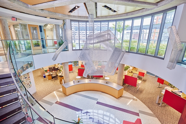 The work Bill facilitates plays on ideas of the sciences, production, innovation, and invention. “I ask myself, what kind of work would resonate with what is going on here? So, I focus on abstractions that touch on macro- and micro-level concepts, lots of color, lots of fundamental geometry,” Bill said. “The purpose is not necessarily to directly inspire people to get right back to work, but rather to help create an atmosphere that is conducive to new ideas.”