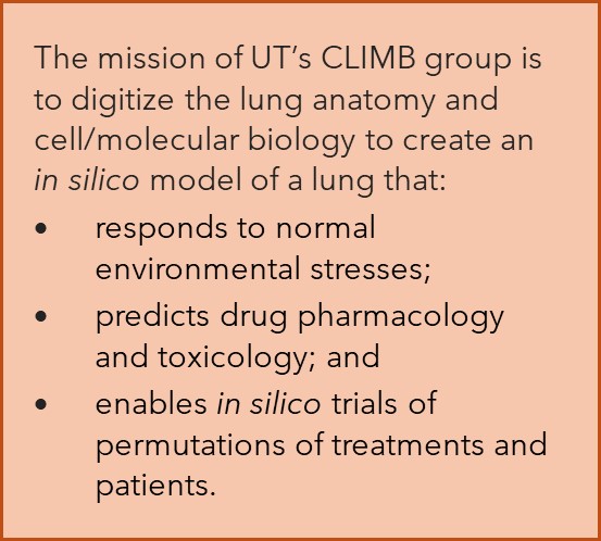 Data-driven discovery: The fundamental building block of the CLIMB group’s work is data. Joe Bender explained the team’s primary goal in practical terms. “My team and I—there are 13 of us today and we are growing—are trying to build a digital model of a human lung that is so faithful to the biology of an actual human lung that the U.S. Federal Drug Administration (FDA) approves its use to inform the design of our 3D printed lungs.”